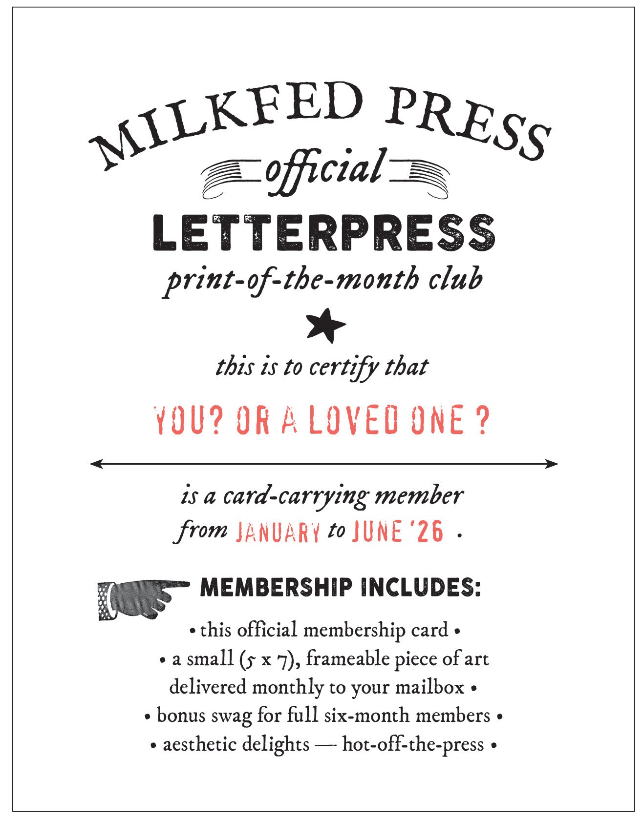 After taking a break, I'll be back in action in the new year with 6 monthly letterpress prints sent right to yours (or a loved one's) mailbox!