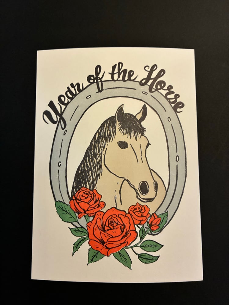 I created this illustration with pen and ink, and then translated it into the letterpress realm. Printed in 5 colors/press runs, it’s a great way to celebrate the new year. Final size is 5” x 7”.